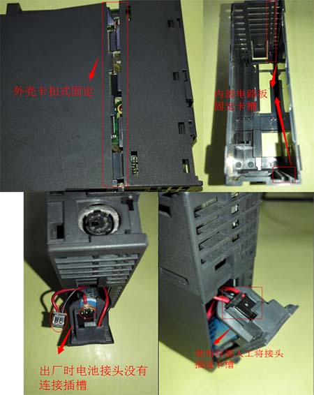 Q00U/Q01UCPU內部是單PCB電路板,因此空間大,而固定方式又采用的是塑料卡扣式,非螺絲固定(圖一),其優點是有彈性抗震能力強,但易產生彈性縫隙。(而以前的老型號CPU是雙電路板螺絲固定)。