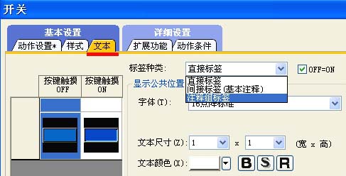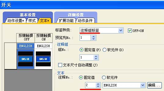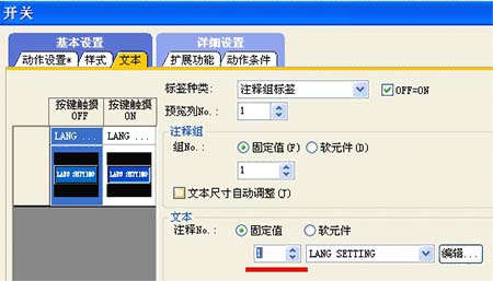 我們在窗口畫面中加入兩個開關做語言切換和一個返回開關。開關的建立和第一個開關建立相似,標簽種類都為注釋組標簽,動作都設為點動。軟元件名分別為 M10、M11、M12。文本注釋 NO 的固定值分別為 2、3、4。
