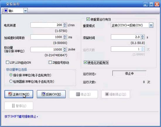 2、 打開<測(cè)試運(yùn)行>菜單下<定位運(yùn)行>,設(shè)置轉(zhuǎn)速/加減速/移動(dòng)量,根據(jù)實(shí)際情況設(shè)置,移動(dòng)量不需要設(shè)置太大。打鉤<重復(fù)運(yùn)行有效>和<老化功能有效>,作用是實(shí)現(xiàn)重復(fù)往復(fù)運(yùn)動(dòng),然后點(diǎn)擊運(yùn)行啟動(dòng),這樣電機(jī)就可以自動(dòng)往復(fù)運(yùn)行了,為一鍵式調(diào)整做好準(zhǔn)備。