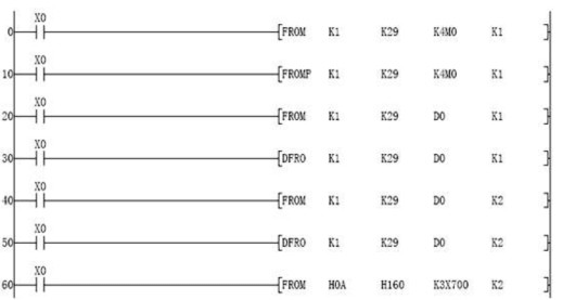 0行:當(dāng)X0=1時(shí),讀取1號(hào)(第1個(gè)K1)三菱PLC模塊緩沖區(qū)地址29(K29)的數(shù)據(jù)保存到M0~M15的16點(diǎn)(K4)中間繼電器中。