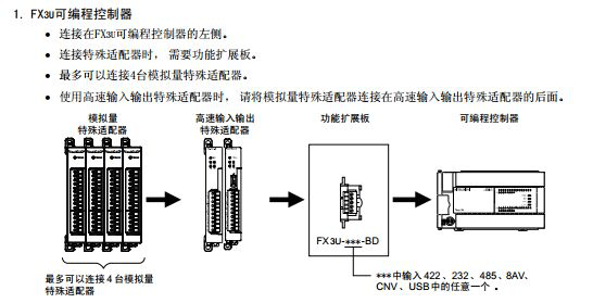 下面的圖片是小編從三菱FX3U系列PLC用戶手冊(硬件篇)上截下來的,都是一些關于三菱FX3U系列PLC連接三菱PLC擴展模塊的說明以及方法!