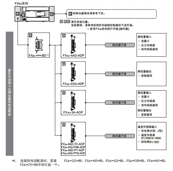 據小編了解,三菱FX3U系列PLC最多可以連接4臺三菱PLC模擬量特殊適配器,最多可以連接8臺三菱PLC特殊功能模塊。
