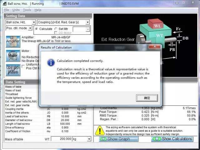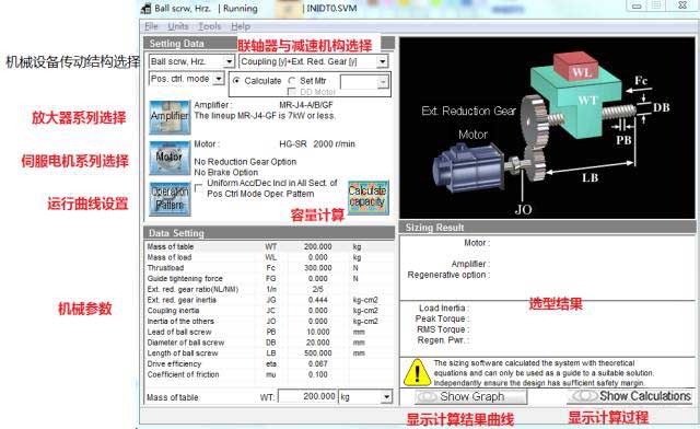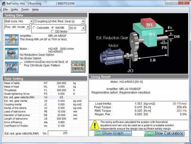 若計算出錯,或者所選伺服放大器/電機無法匹配,會出現以下畫面,在選型結果處顯示相關信息,不符合要求的參數紅字表示。
