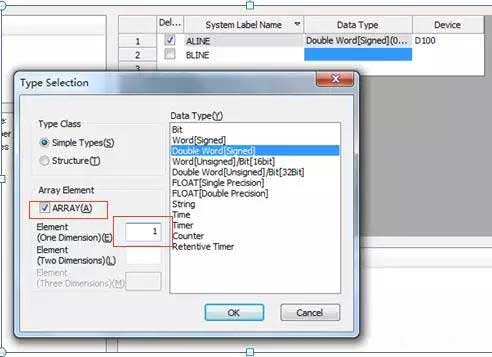 下面說明32位標簽數據的設置,筆者將設置標簽為”ALINE”表示D100-D101的雙字數據。