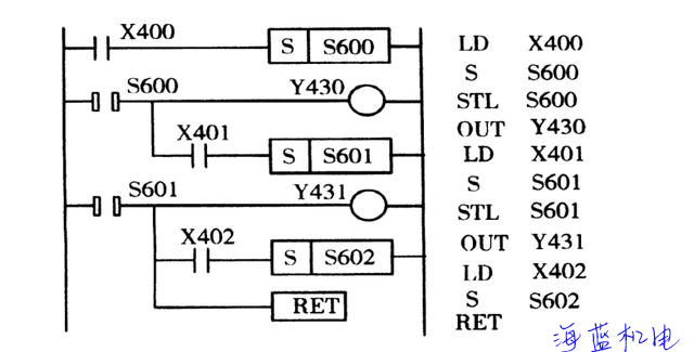 圖1 -11 所示,當觸頭 X400 閉合時,狀態(tài)器S600 得電并內(nèi)部自鎖,其步進輸出觸頭